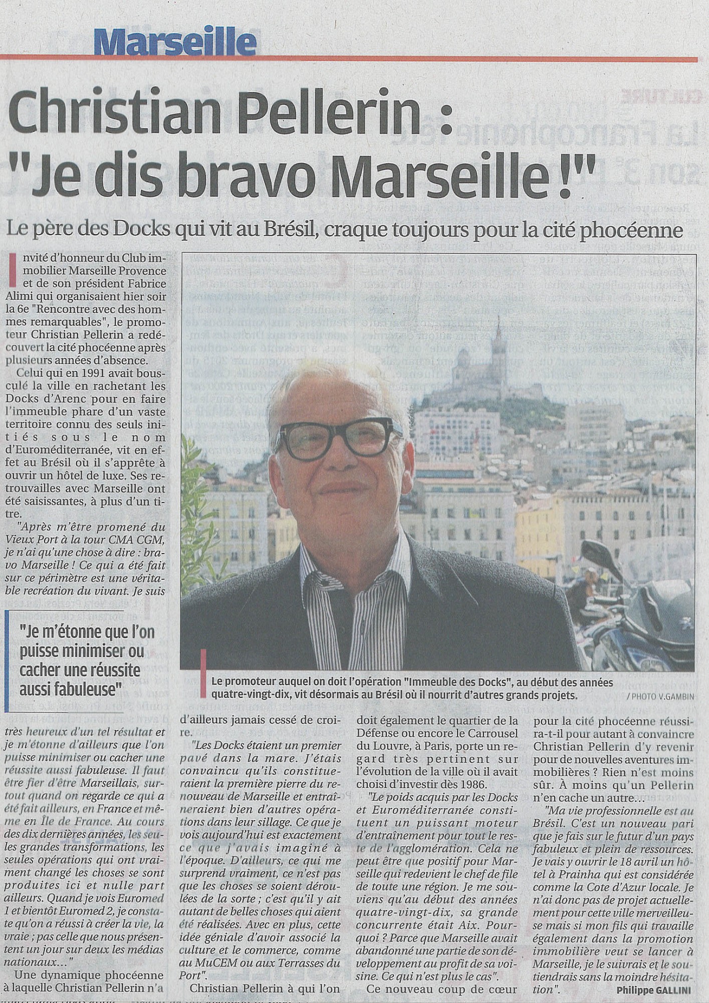 Invité d'honneur du Club Immobilier Marseille-Provence et de son président Fabrice Alimi qui organisaient hier soir la 6e "Rencontre des hommes remarquables", le pormoteur Christian Pellerin a redécouvert Marseille après plusieurs années d'absence: "Après m'être promené du Vieux Port à la Tour CMA CGM, je n'ai qu'une chose à dire: Bravo Marseille! d'un tel résultat et je m'étonne d'ailleurs que l'on puisse minimiser ou cacher une réussite aussi fabuleuse. Il faut être fier d'être Marseillais,surtout quand on regarde ce qui a été fait ailleurs, en France et même en Île de France."