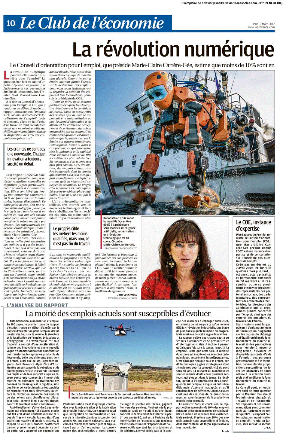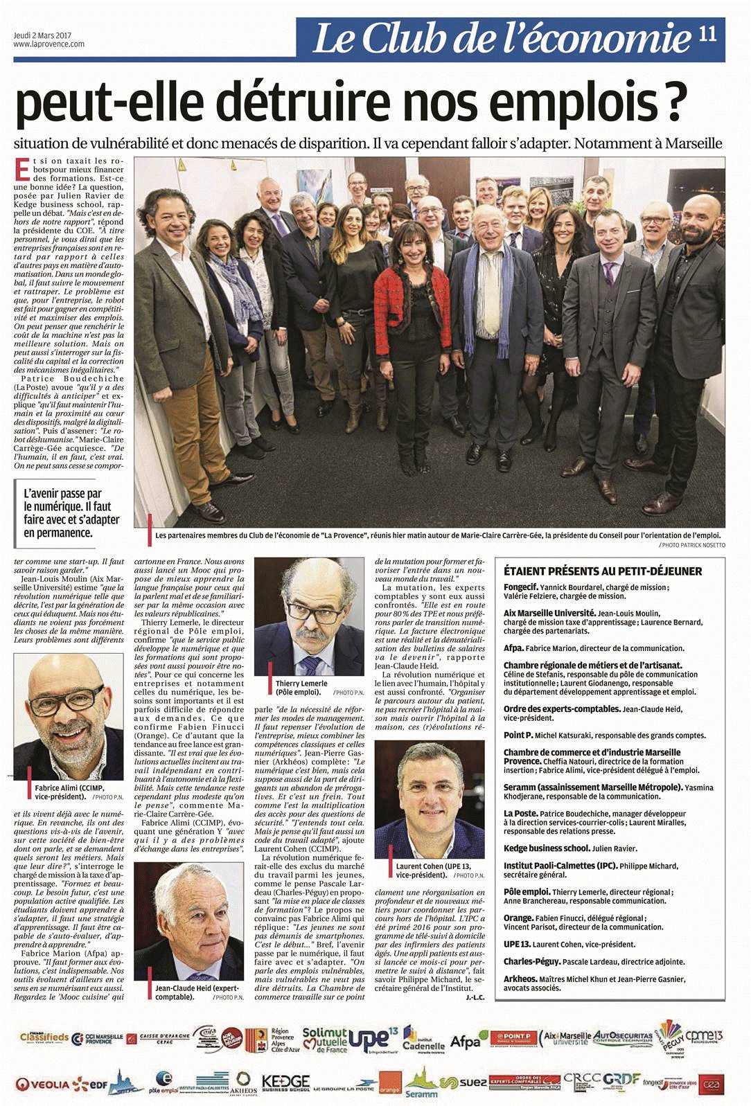 L'aire métropolitaine marseillaise, très tournée vers les nouvelles technologies et fière de sa labellisation "french tech" est-elle plus, ou moins vulnérable ? "Il y a ici des atouts. Mais il y a aussi un manque de qualifications. Ce qui frappe, c'est la faiblessedes cadres et cadres supérieurs. Il y a moins de fonctions métropolitaines qu'en Île-de-France ou en Rhône-Alpes. Mais ce constat est moins robuste que l'étude globale. Disons qu'ici, la vulnérabilité serait légèrement supérieure à ce qu'elle est au niveau national", répond Marie-Claire Carrère-Gée. Comment mieux anticiper les évolutions et s'y adapter ? "En formant et beaucoup. Il faut donner des compétences en lien avec les outils technologiques", répond la présidente du COE. Avant d'ajouter durant le débat, qu'il faut aussi prendre en compte de nouveaux modes de management "car la numérisation rend plus autonome et plus flexible". À son sens, "apprendre à apprendre" reste la meilleure des garanties. L'analyse du rapport : la moitié des emplois actuels sont susceptibles d'évoluer