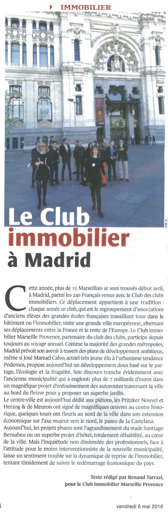 Tradition ancrée, le Club des clubs immobiliers a effectué récemment son déplacement annuel. Ce déplacement consiste à visiter une grande ville européenne, alternant ainsi entre la France et le reste de l'Europe. Cette année, ce fût le tour de Madrid.