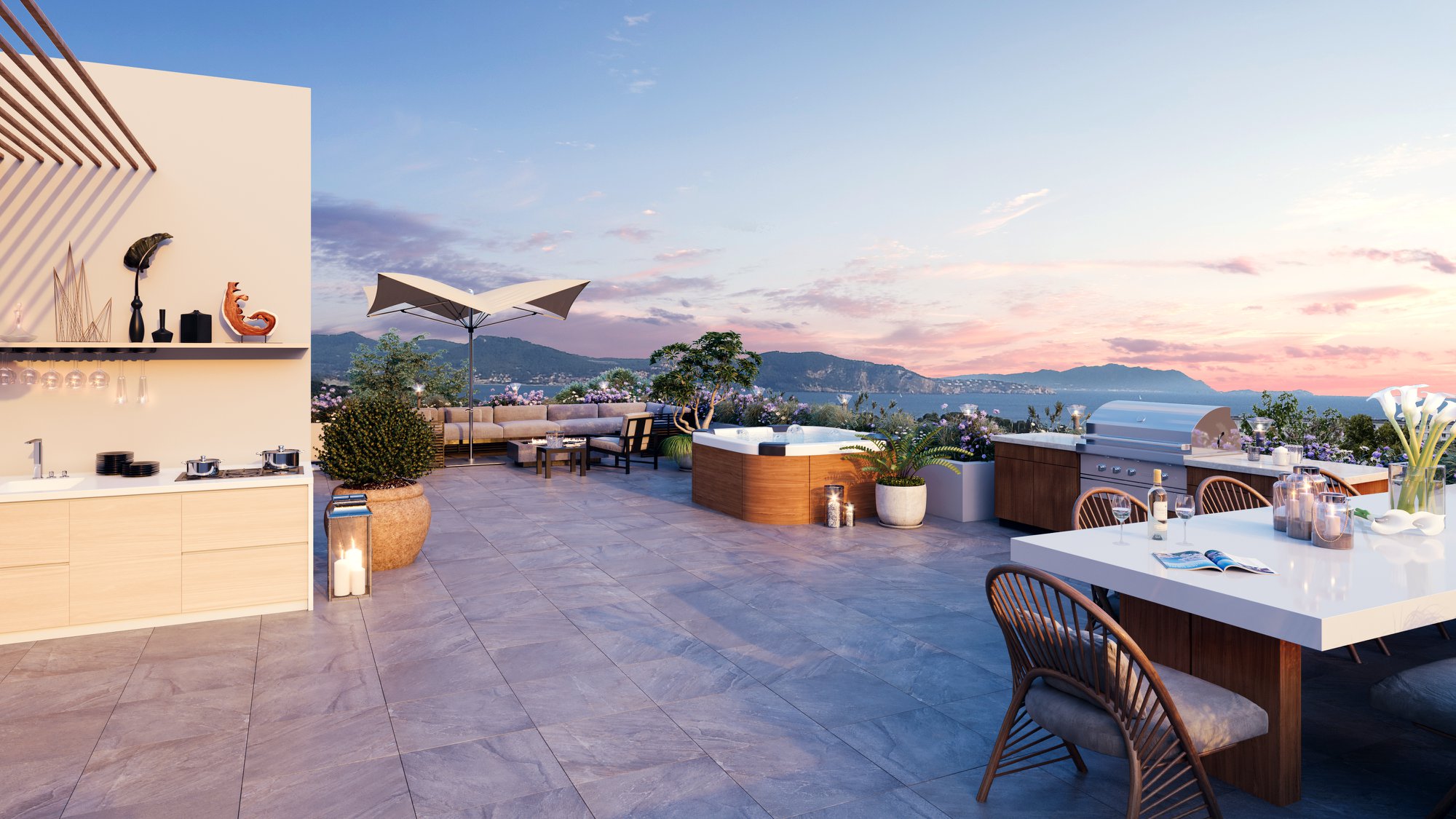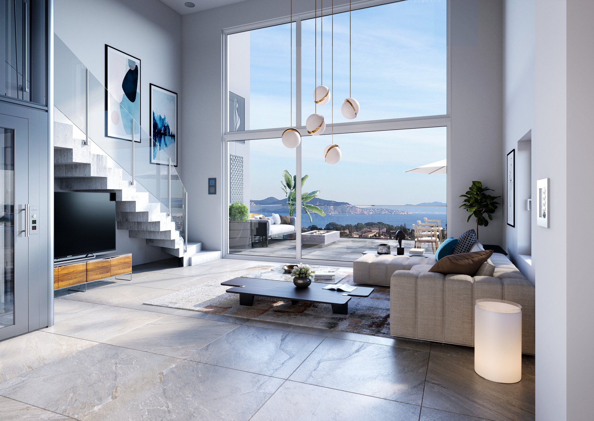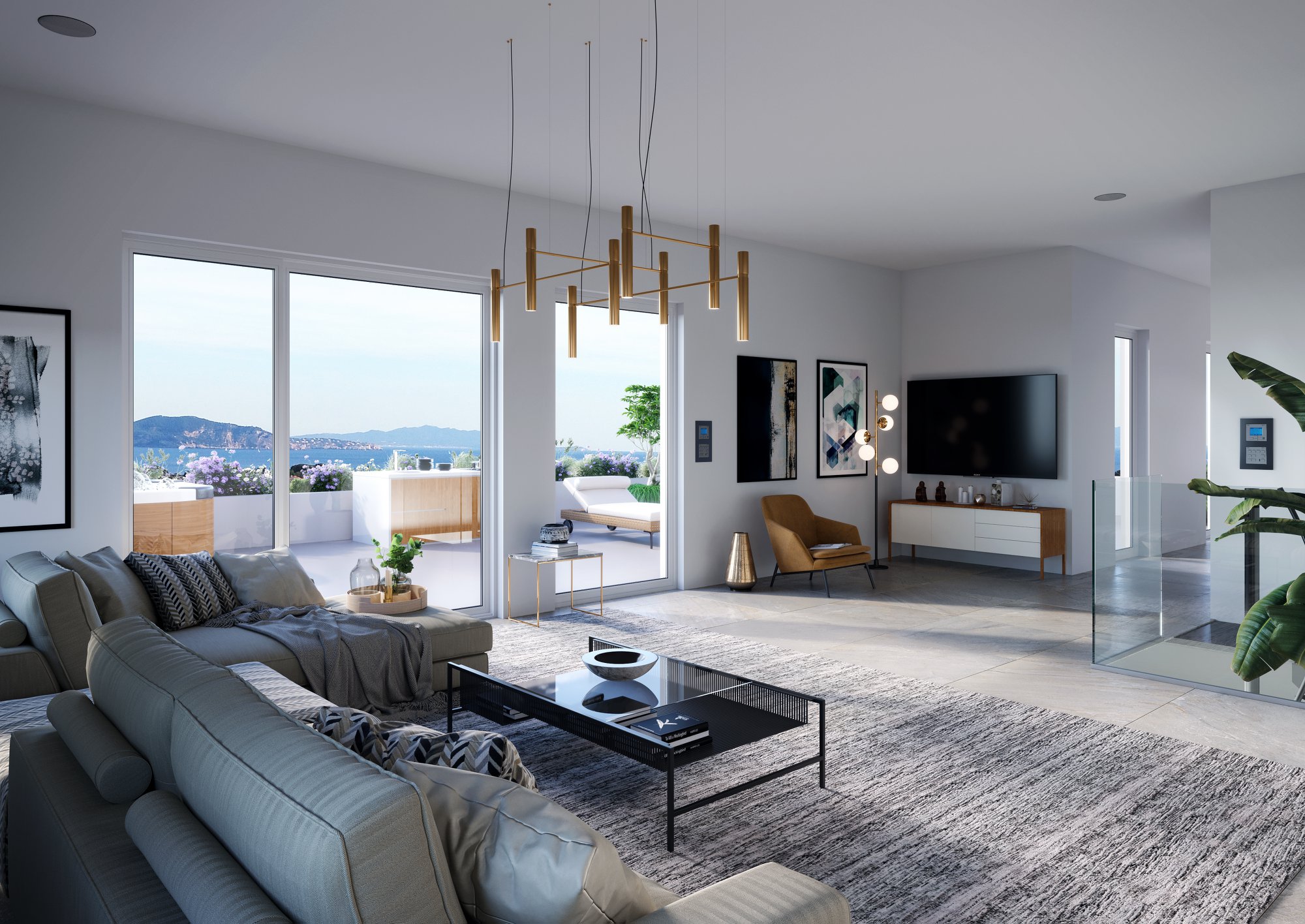 Immense baies vitrées en mode « plein écran », carrelage intérieur 60x60, parquet en option dans le coin nuit, régulation température par thermostat connecté, WC suspendu, volets roulants électrique, vastes terrasses avec jardinières, acenseur, box en sous-sol, borne individuelle de recharge véhicule électrique (en option), climatisation.