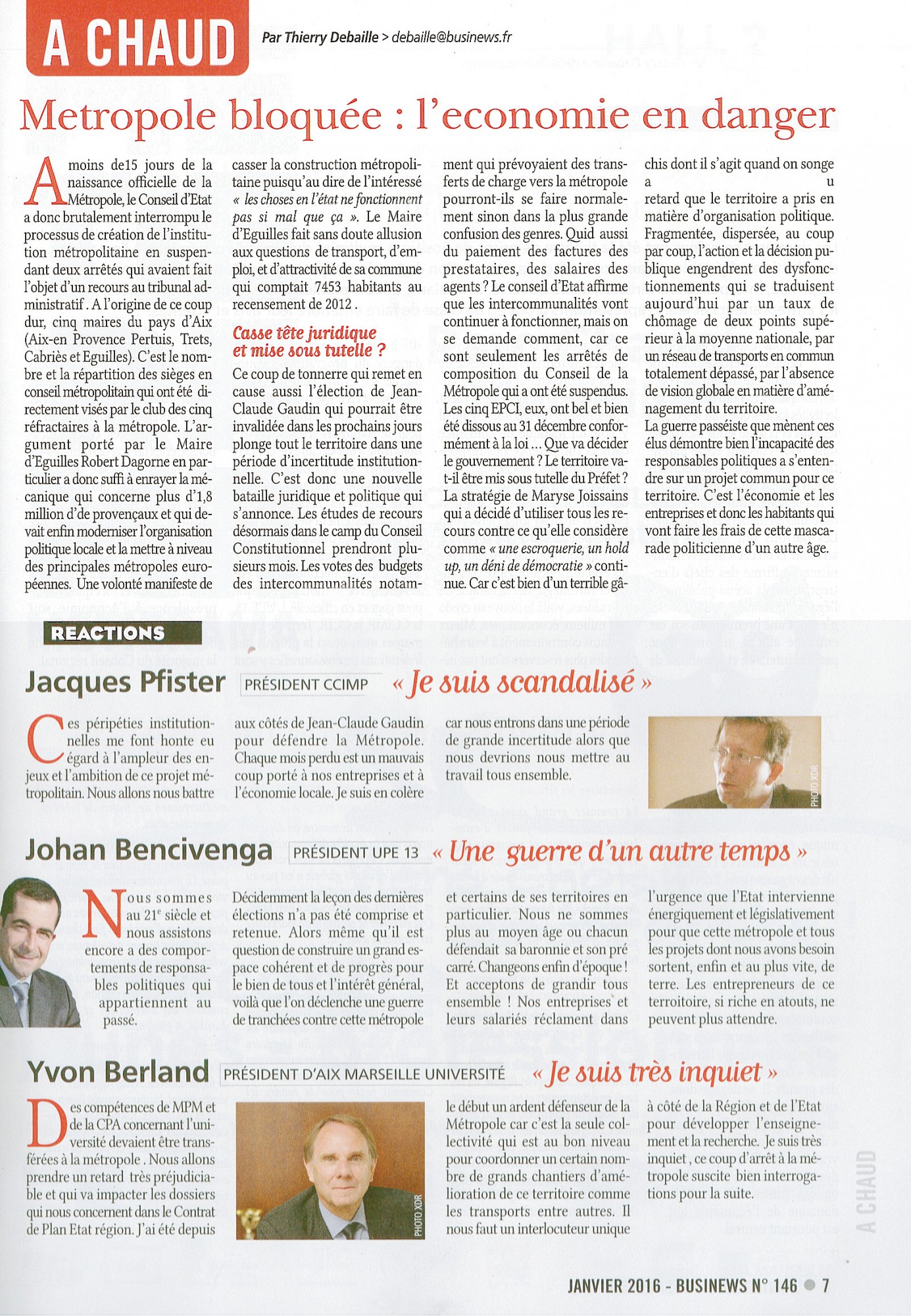 Jacques Pfister, président du CCIMP, se dit "scandalisé et en colère car nous entrons dnas une grande période d'incertitude alors que nous devrions nous mettre au travail tous ensemble". Quant à Johan Bencivenga, président de l'UPE 13, il qualifie ce conflit de "guerre d'un autre temps" et ajoute ainsi "voilà que l'on déclenche une guerre de tranchées contre cette métropole et certains de ses territoires en particulier. Nous ne sommes plus au moyen âge où chacun défendait sa baronnie et son pré carré. Changeons enfin d'époque!"