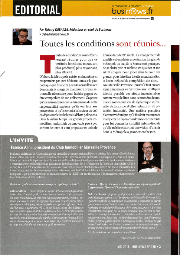 Invité dans ce numéro de mai 20165, Fabrice Alimi y partage son point de vue sur d'autres sujets abordés tels que le dépoiement de Barjane, "Toute stratégie de développement urbain associé à la ville durable, c'est l'avenir".